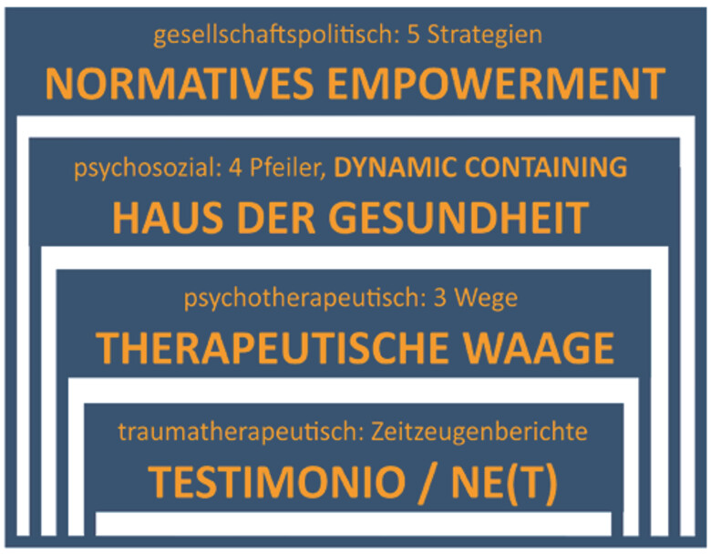Diese Intervention verweist auf den dritten Bestandteil des Dynamic Containing: die psycho(trauma)therapeutische Konfrontation im geschützten Rahmen. Der belastende Inhalt wird punktuell zugelassen, aufgefangen und integriert, ohne die Selbststruktur zu überfordern. Die narrative Exposition ist dabei Teil einer Vier-Rahmen-Konzeption : Sie wird therapeutisch «abgewogen» (Waage), auf ein tragendes Fundament gestellt (Haus der Gesundheit) und gesellschaftlich rückgebunden (Normatives Empowerment). Im Testimonio , dem dokumentierten Zeitzeugenbericht, konkretisieren sich die fünf Strategien Normativen Empowerments, in Frau N.s Fall etwa als Stimme gegen patriarchale Gewalt. Ihr Bericht steht symbolisch für zivilgesellschaftliche Ermächtigung, rechtlichen Schutz, Wahrheitsarbeit, Befreiung aus Unterdrückungsmustern und Veröffentlichung von Verfolgungserfahrungen.