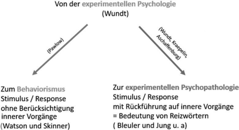 Wilhelm Wundt (1832–1920) prägte mit dem ersten experimentalpsychologischen Labor in Leipzig die Psychologieforschung, indem er Assoziationen unter kontrollierten Bedingungen am Menschen vermass, nämlich mit Stoppuhr und physiologischen Messgeräten. Aus dem experimentellen Vorgehen entwickelten sich zwei Denkrichtungen in der Psychologie: Einerseits rückte durch das Beobachten von experimentell induziertem Verhalten die Konditionierung als Grundlage für Lerntheorien in den Vordergrund. Wegbereiter hierfür waren Iwan Pawlow (1849–1936), John B. Watson (1878–1958) und B. F. Skinner (1904–1990). Andererseits rückten in der Psychiatrie Störungen des Denkens und affektiv aufgeladene Reaktionsmuster ins Zentrum der Aufmerksamkeit, wobei als wesentliche Vertreter Emil Kraepelin (1856–1926), Eugen Bleuler (1857–1939), Sigmund Freud (1856–1939) und Carl Gustav Jung (1875–1961) zu nennen sind. Die beiden Interessensfelder unterscheiden sich hinsichtlich der Betonung innerer oder äusserer Vorgänge. Die behavioristische Linie entwickelte ihre Theorien mit Blick auf das Verhalten, also ohne Berücksichtigung innerer Vorgänge, und die experimentelle Psychopathologie führt ihre Überlegungen auf diese zurück (Abb. 1).