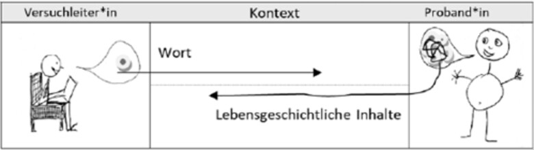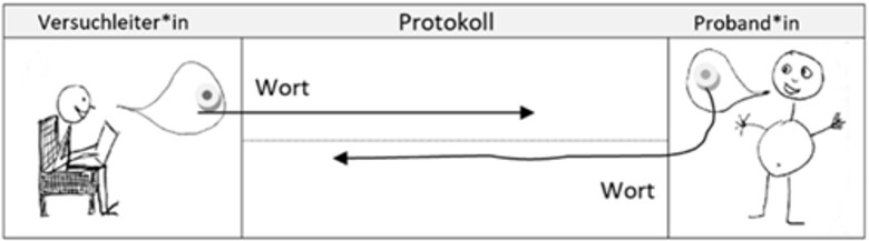 1. Assoziationsphase: Hier nehmen die*der Versuchsleiter*in (Therapeut*in) und die*der Proband*in (Abb. 2) gegenüber Platz. Die testende Person hat eine Liste mit 50 Reizwörtern in der Hand, eine Stoppuhr und einen Stift. Die Testinstruktion besteht aus der Anweisung, dass auf jedes einzelne Reizwort mit dem ersten Wort reagiert werden soll, das der Versuchsperson dazu einfällt. Dadurch wird jedem Reizwort unter Stress ein Wort als Antwort dazugestellt. Protokolliert werden die Antwort, die Reaktionszeit und auffällige nonverbale Ausdrucksformen der untersuchten Person. Die Erstellung des Protokolls erfolgt vonseiten der testenden Person möglichst neutral und dient als Grundlage für den zweiten Durchgang.