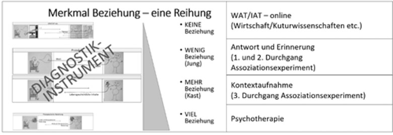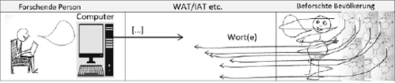 Weiterführende Varianten. Eine fortführende Variante dieses Vorgehens stellt das Besprechen der aus dem Test resultierenden Lebensthemen im Rahmen weiterführender Psychotherapie dar (Kast, 1988). Dieser Prozess ist nicht Teil des Experiments, sondern nutzt das AE als Bestandteil der therapeutischen Beziehungsarbeit (Abb. 4). Diese Begegnung im Rahmen eines therapeutischen Settings ist Teil der Heilbeziehung. Sie zeigt einen höheren Grad an Komplexität als im künstlich eingeschränkten Austausch während des Testvorgangs. Auf der anderen Seite gibt es reduzierte Varianten mit vermindertem Beziehungsgeschehen im genannten Sinne. Dazu zählen Online-Wortassoziationstests (WAT/IAT), die bspw. im wirtschaftlichen oder kulturwissenschaftlichen Kontext angewendet werden (Abb. 5). Diese Variante in der Versuchsanordnung zeigt eine verminderte Komplexität im Beziehungsgeschehen als im Testdesign des AE, da die einseitige Befragung über den Computer nicht an bestimmte persönliche Beziehungen geknüpft ist.
